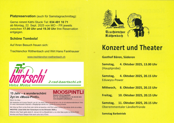 Auch dieses Jahr dürfen wir wieder unser Konzert + Theater im Bären Süderen durchführen. Alle Informationen können Sie dem Flyer unten entnehmen. Sie können den Flyer ebenfalls herunterladen.