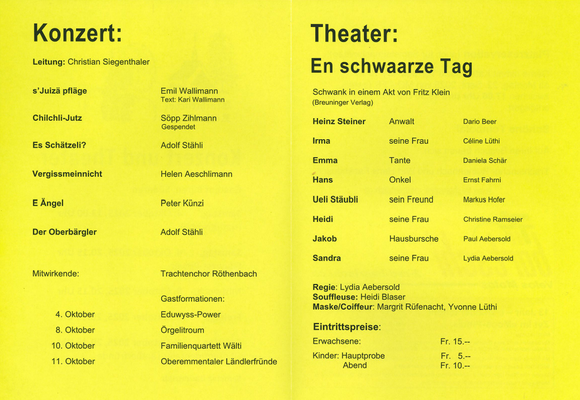 September= Plakat verteilen, intensive Konzertvorbereitungen, an Liedstellen schleifen, Theater nochmals durchspielen, definitive Kleiderwahl für Theaterleute aussuchen, Schminken der Theaterleute üben, Tombola vorbereiten, Platzreservationen entgegen nehmen, Trachtenhemder glätten, Trachtenblüemli bestellen, Trachtensilber reinigen und wieder aufnähen, unsichere Liedtextstellen eintrimmen, Hauptprobe planen....und, und, und.